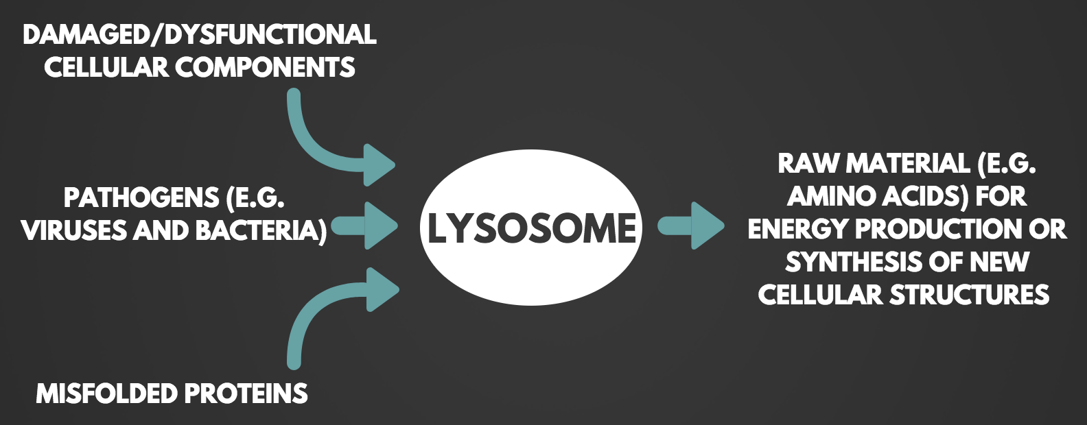 Lysosomes contain all the enzymes needed to breakdown proteins, nucleic acids, carbohydrates and lipids, some people like to refer to the lysosome as the stomach of the cell. Not only do they contain the enzymes needed to breakdown cellular waste, but their membranes contain the transport proteins needed to recycle anything that can be reused by the cell. So, the lysosome is like a little recycling plant, taking in useless material, breaking it down and returning the useable components. This is an important action in autophagy, because not only can we remove these damaged proteins or structures but we provide the building blocks to make new and better ones!